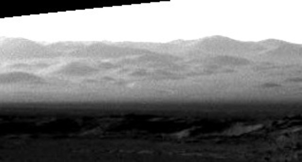 A droite de l’image ci-dessus, à droite du soleil, on voit au loin le S caractéristique de la vallée Peace dans les alluvions de laquelle opérait Curiosity dans sa zone d’atterrissage (doc. NASA/JPL-Caltech)
