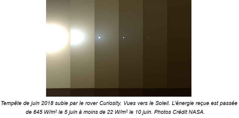 Sur Mars, par rapport à ce qui se passe sur la Lune, le phénomène est aggravé par l’atmosphère. On sait que cette atmosphère est très ténue (pression de 610 pascals à l’altitude « moyenne », équivalente à celle du niveau de la mer sur Terre). Avec la sécheresse ambiante des quantités énormes de grains de poussière et dans une moindre mesure de sable peuvent être emportés dans des « tempêtes de poussière » qui ne sont pas exceptionnelles. Toutes les trois années martiennes environ, elles peuvent devenir planétaires et durer plusieurs semaines en obscurcissant le ciel, limitant fortement sinon empêchant totalement l’utilisation de l’énergie solaire et tendant à pénétrer les rouages des machines ou les interstices des volumes qui devraient être clos. Cela a beaucoup gêné la fin de la mission Opportunity. Les deux roues avant du rover avaient été immobilisées, usées certes par les aspérités du sol mais dont les articulations avaient aussi été complètement grippées par la poussière.