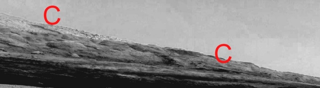Le mont Sharp dont on n’aperçoit probablement pas le sommet caché derrière les premières pentes. Au premier plan, mais déjà à quelques kilomètres, la zone de dunes sombres. On distingue différents types de terrains sur le flanc de la montagne : un premier range de mesas et monticules, puis au-dessus (repère A) des terrains à stratification inclinée de la gauche vers la droite, puis encore au-dessus des terrains à stratification d’apparence horizontale (repère B). A droite la vallée d’écoulement, objectif de Curiosity, apparait probablement en deux endroits repérés par la lettre C. L’image en haute définition est téléchargeable sur : http://photojournal.jpl.nasa.gov/jpeg/PIA16101.jpg. (Doc. NASA/JPL-Caltech/MSSS –repérages APM)