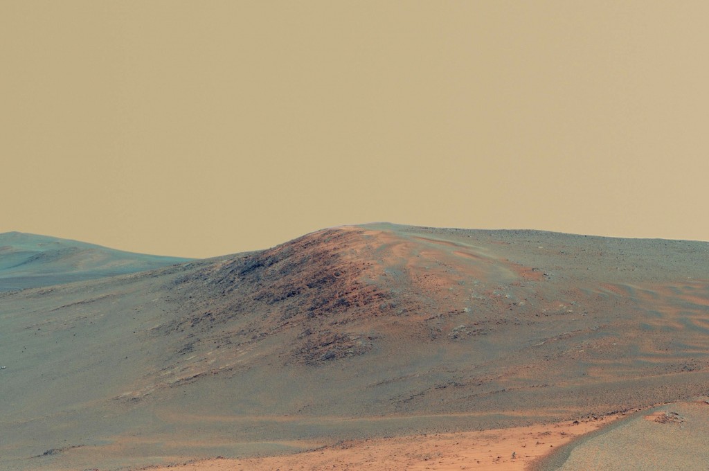 Le rover Opportunity a quitté depuis le 8 mai son point d’hivernage de Greeley Haven mais la NASA vient de publier un panorama sur 360 ° du paysage vu depuis ce point d’hivernage (voir http://www.jpl.nasa.gov/spaceimages/details.php?id=PIA15689 ). Ce panorama résulte de la juxtaposition de 817 images élémentaires prises entre le 21 décembre 2011 et le 8 mai 2012 par la Pancam au travers de filtres à 753 nanomètres (proche infra rouge), 535 nanomètres (vert) et 432 nanomètres (violet). L’ensemble est présenté en fausses couleurs. L’image est ici présentée en résolution moyenne mais peut être téléchargée en haute définition (13,8 mégas) sur : http://photojournal.jpl.nasa.gov/jpeg/PIA15689.jpg.