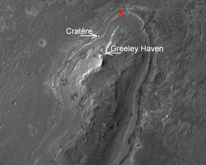 Les traces d’arrivée du rover à Greeley Haven vers le Sud. (NASA/JPL-Caltech/Cornell/Arizona State Univ.)