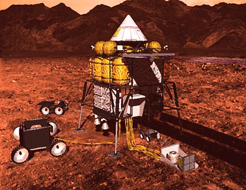 - L'option consistant à exploiter le sol martien pour en extraire de l'eau n'a pas été retenue non plus en raison de la complexité et des risques des opérations à la surface de Mars. Un grand potentiel existe, mais les risques sont mal connus et les besoins en terme de masse sont peut-être sous-estimés.