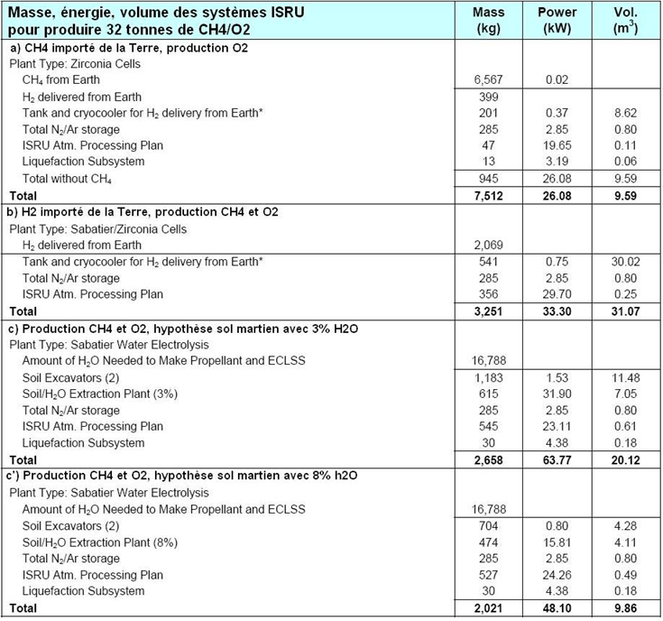 Le plus simple est de prendre un cas particulier. Dans le cas de la mission de référence de la NASA de 2009, il faut qu'un véhicule décolle de Mars pour rejoindre en orbite le vaisseau de retour vers la Terre. L'orbite visée est une ellipse de 250 x 33793 km, ce qui nécessite un Delta V de 5,625 km/s. La NASA a calculé que la masse des ergols pour un véhicule à 2 étages était d'environ 32 tonnes, le véhicule pesant 46 tonnes au total. Nous présentons ci-dessous un tableau modifié par nos soins (essentiellement copié du rapport de la NASA avec quelques lignes en Français) afin de montrer les besoins massiques des systèmes ISRU pour chacune des options citées précédemment. Comme on peut le voir, la masse de ces systèmes est relativement faible devant la masse de carburant dont on a besoin. Le gain est donc évident et justifie qu'on s'intéresse à l'exploitation des ressources locales.