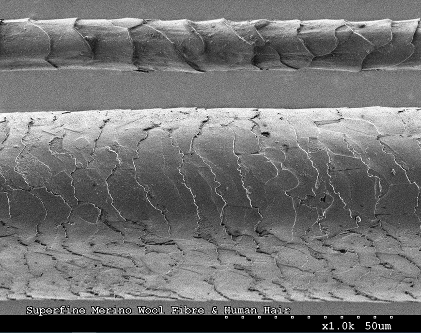 L’équipage est la principale source de particules : peau, cheveux, vêtements, respiration. Même sans poussière externe, les particules organiques (COV) sont omniprésentes. Exemple ci-dessous : Image au microscope d'un cheveu (en haut) et d'une fibre de laine (en bas). Copyright : Creative Commons. © CSIRO, CC BY 3.0