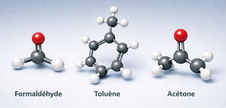 | Formaldéhyde (HCHO) | Peintures, résines, plastiques | Irritation yeux, nez, gorge ; toxique |
