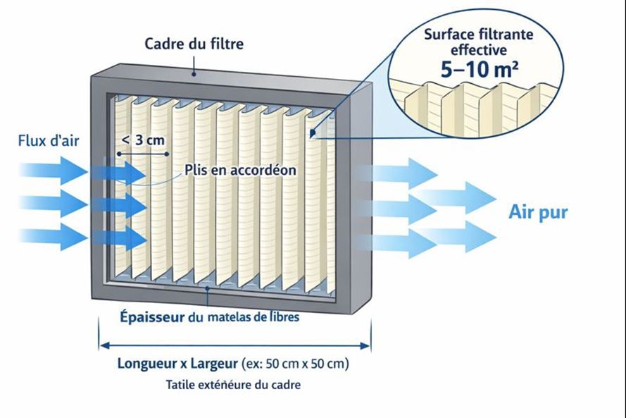 Filtre HEPA (High Efficiency Particulate Air) : il retient ≥99,97 % des particules >0,3 µm. Il fonctionne par 4 mécanismes combinés :
