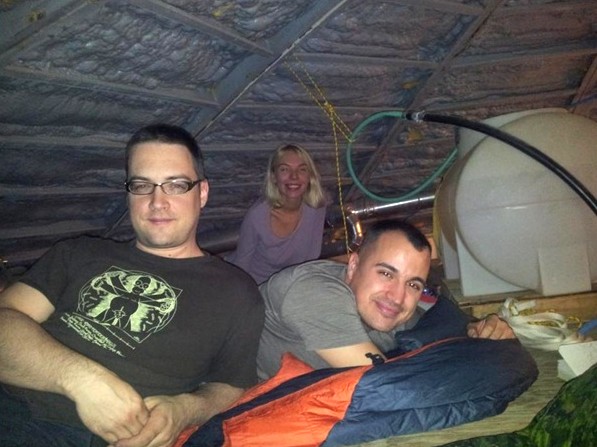 Nous avons été accueillis par l’équipage en place (Crew 142). Comme les deux équipages étaient en situation de « hors simulation », nous sommes allés chercher des pizzas à Hanksville pour partager le dîner. Comme il n’y a que six chambres, quatre d’entre nous ont dormi dans le loft (Claude-Michel en premier plan, Paul Sokoloff, Anastasiya au dernier plan, et moi-même dernière la caméra) et deux autres sur le sol de la cuisine.