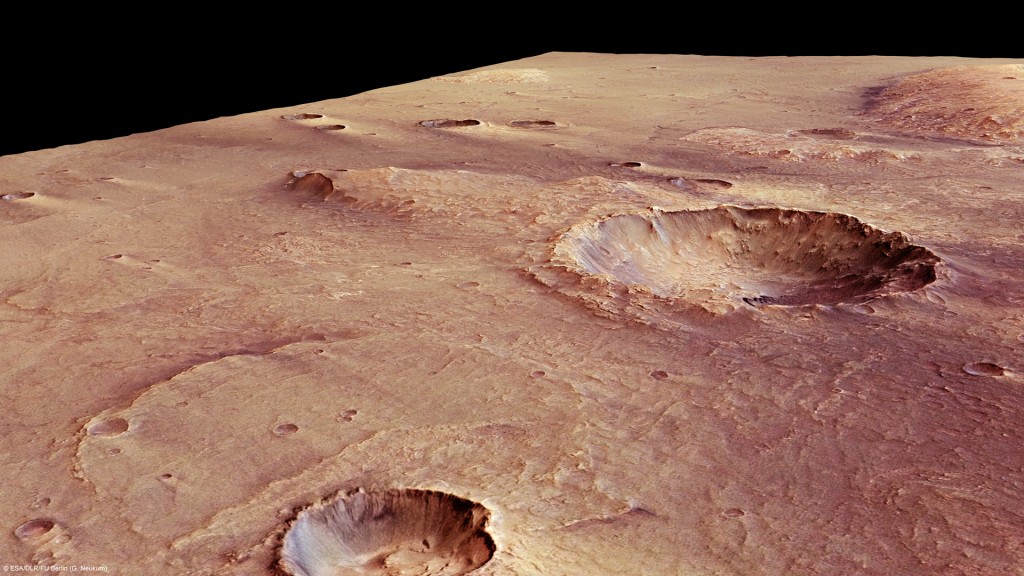 Vue depuis le Nord Est. On voit sur tout le quart bas gauche de l’image un grand cratère qui a été complètement rempli par l’écoulement de lave qui a marqué la région.(Doc. ESA/DLR/FU Berlin (G. Neukum))
