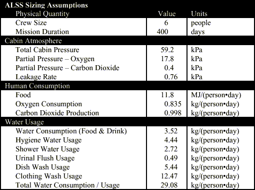 Dans le rapport cité ci-dessus, la NASA a posé des hypothèses, notamment sur le nombre d'astronautes, la composition de l'air, la consommation journalière d'eau, etc., afin d'estimer la masse des systèmes de support de vie pour un module habité. Ces hypothèses sont discutables, mais permettent de se faire une idée générale, à la fois sur la consommation journalière de chaque élément, les sous-systèmes existants et sur leur masse approximative. Voici deux tableaux de synthèse extraits de ce rapport (en Anglais), le premier qui résume les hypothèses et le deuxième qui indique la technologie choisie et la masse de chaque sous-système.