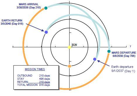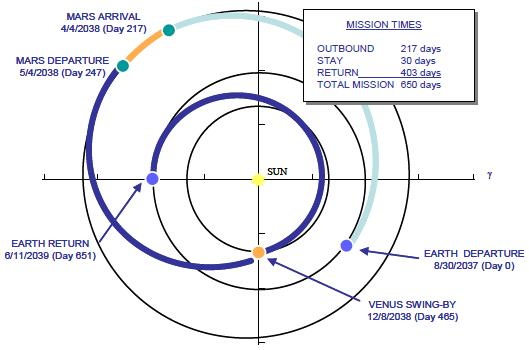 La plupart des scénarios proposés par les spécialistes sont basés sur des missions de type conjonction, avec une trajectoire proche de Hohmann et une durée globale de la mission de l'ordre de 3 ans.
