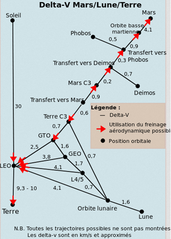 Lorsqu'on lance un vaisseau depuis la Terre, il faut qu'il atteigne la vitesse de libération, soit 11 km/s, pour qu'il échappe à l'attraction terrestre. Cette vitesse doit être atteinte progressivement à partir de l'orbite basse. Ensuite, une fois les ergols épuisés, le vaisseau s'éloigne de la Terre, mais la force d'attraction de notre planète continue de le freiner jusqu'à ce que sa vitesse soit à peine supérieure à 0km/s à environ 1 million de km de la Terre. A cette distance, l'attraction solaire étant plus forte que celle de la Terre, le vaisseau resterait sur une orbite solaire très proche de la Terre. Pour rejoindre Mars, il faut donner au vaisseau en orbite basse une vitesse supérieure à la vitesse de libération, de sorte qu'à 1 million de km de la Terre, la vitesse résiduelle soit suffisante pour changer d'orbite solaire de manière significative et atteindre celle de Mars. La carte des Delta V permet de mieux comprendre combien il faut accélérer les vaisseaux pour atteindre des destinations éloignées.