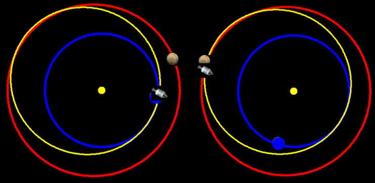 Une fois en orbite basse (LEO = Low Earth Orbit), le vaisseau tourne autour de la Terre à plus de 8km/s, mais il faut encore augmenter la vitesse de 2,5+0,7+0,6=3,8 km/s pour être sur une orbite solaire de transfert vers Mars. En quittant l'attraction terrestre à 1 million de km d'altitude, le différentiel de vitesse par rapport à la Terre n'est que de quelques km/s, mais si on a accélère dans la bonne direction, elle s'ajoute à celle de la Terre autour du soleil (30 km/s) et permet d'atteindre l'orbite martienne. Le vaisseau suit alors une trajectoire dite de Hohmann, la plus économe en ergols. Cette trajectoire est indiquée en jaune ci-dessous, alors que la trajectoire de la Terre est en bleu et celle de Mars en rouge. Pour cette ellipse jaune, le point le plus proche du soleil (périhélie) est la Terre et le plus éloigné (aphélie) est l'orbite martienne.