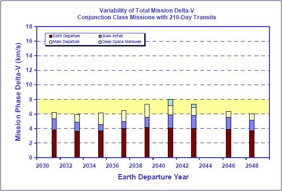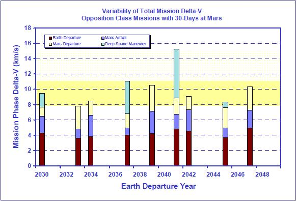En astronautique, le nerf de la guerre si on peut dire, c'est la masse totale de ce qu'il faut envoyer dans l'espace, car c'est elle qui conditionne le nombre de fusées géantes qu'il faut faire décoller et la complexité de la procédure d'assemblage en orbite basse. Rappelons que dans le document NASA DRA 5.0, 9 fusées géantes sont nécessaires à la mission, avec des risques d'échec très importants. Or, ce sont les ergols qui constituent la plus grande partie de cette masse et de loin. Et la quantité d'ergols nécessaire est directement liée aux besoins énergétiques, qui peut s'exprimer en "delta V", c'est-à-dire en nombre de km/s qu'il faut gagner à chaque phase de la mission. Voici ci-dessous (extrait du rapport NASA) un bilan des besoins en fonction de la date de départ de la mission. Cela varie en effet fortement en fonction de la position de Vénus et du contexte de rapprochement de Mars par rapport à la Terre (Mars a une trajectoire elliptique excentrée autour du soleil). Comme on peut le voir, les missions de type conjonction minimisent les besoins énergétiques et donc la masse des ergols. Bien entendu, une mission plus longue sur Mars nécessiterait plus de consommables, mais cette masse additionnelle ne serait rien en comparaison de la masse additionnelle des ergols si on choisit une mission de type opposition. Sur le plan massique, donc, c'est la mission de type conjonction qui est incontestablement plus efficace.